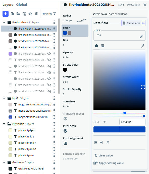 Next, we move on to choosing colors for the circles; for this exercise, I want to see just one or two engine areas highlighted. We can execute this strategy through the use of a data condition. We set the default (fallback) color to a shade of gray, and then tell Mapbox to use a vivid blue for Engine Area = E58. FYI, I followed the same process in another layer for Engine Area = E54.