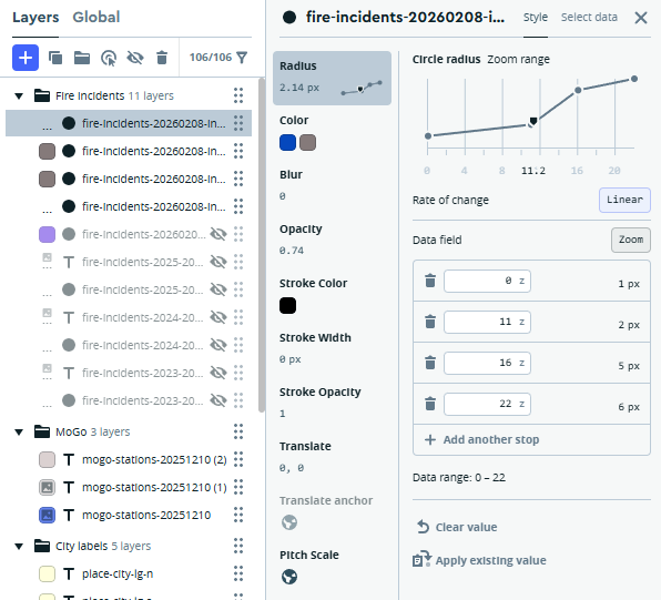 It’s important to note that a single style may host many tilesets (typically as layers in a single folder); we can then elect to display one or more of these layers while hiding others. Let’s now take a quick look at how I chose to display some elements in the fire incidents data.