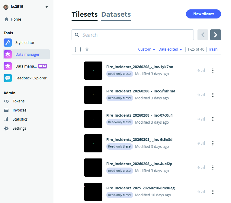 In our example, the imported data sets are in the previously created .csv files; Mapbox also accepts files in GeoJSON, GPX, Shapefile, and KML formats. The import process can be initiated by selecting the New tileset button from the Tilesets tab in Mapbox. A few of my previously imported files are shown below: